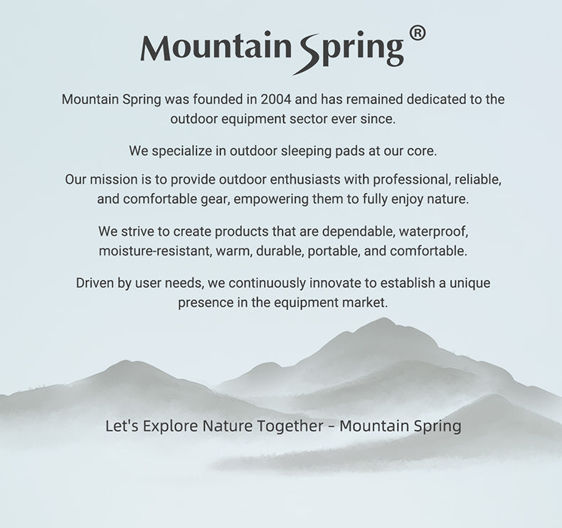 Founded in 2004, Mountain Spring (山之泉) is a specialist outdoor brand dedicated to designing and manufacturing complete sleep system gear for camping and backpacking.